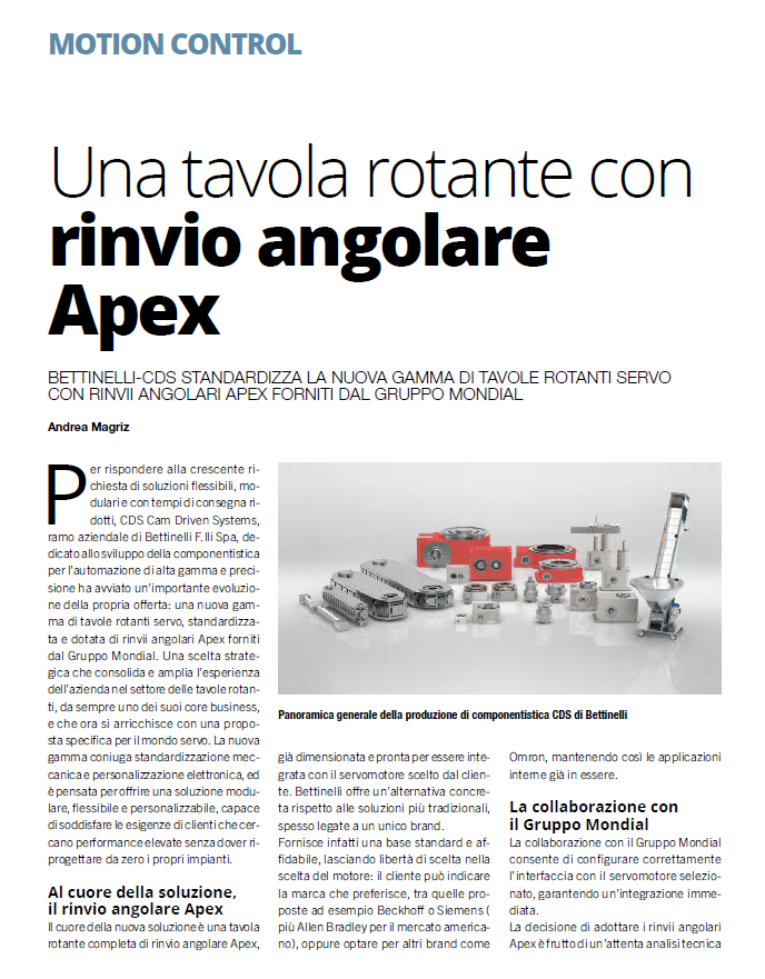 Bettinelli-CDS amplia la propria offerta per l’automazione industriale introducendo una nuova gamma di tavole rotanti servo standardizzate dotate di rinvii angolari Apex forniti dal Gruppo Mondial. Questa soluzione risponde alla crescente domanda di sistemi flessibili, modulari e con tempi di consegna ridotti, garantendo al contempo prestazioni elevate e integrazione rapida negli impianti esistenti.